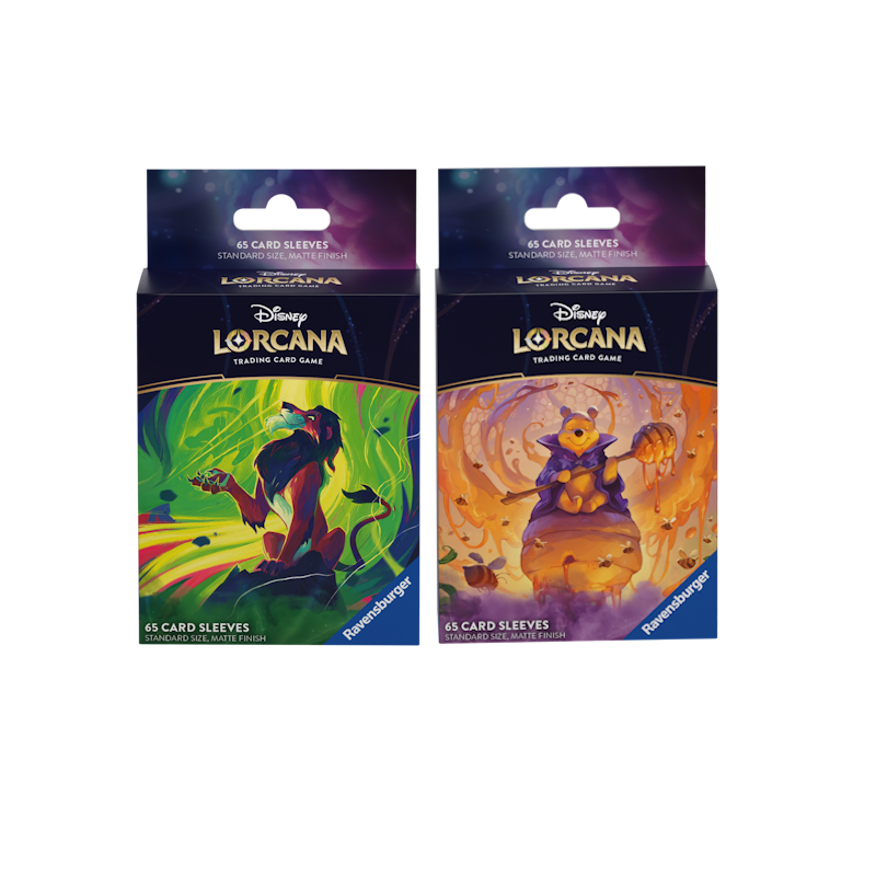 Elk pakket bevat 65 matte finish kaarthoezen met een Disney Lorcana glinstering. De eerste personages die te zien zijn, zijn Scar en Winnie The Pooh.