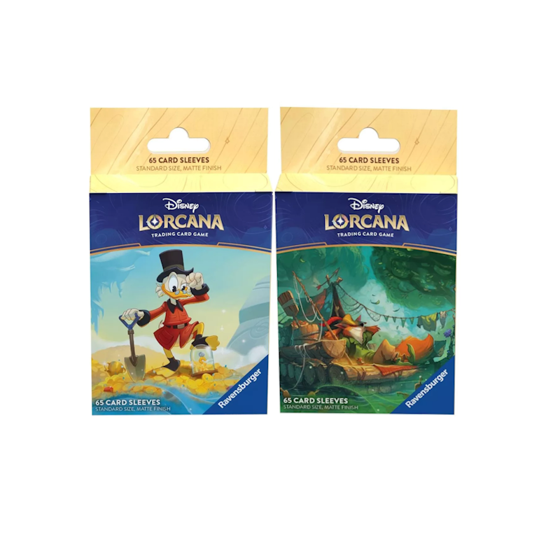 Elk pakket bevat 65 matte finish kaarthoezen met een Disney Lorcana glinstering. De eerste personages die te zien zijn, zijn Dagobert Duck en Robin Hood.