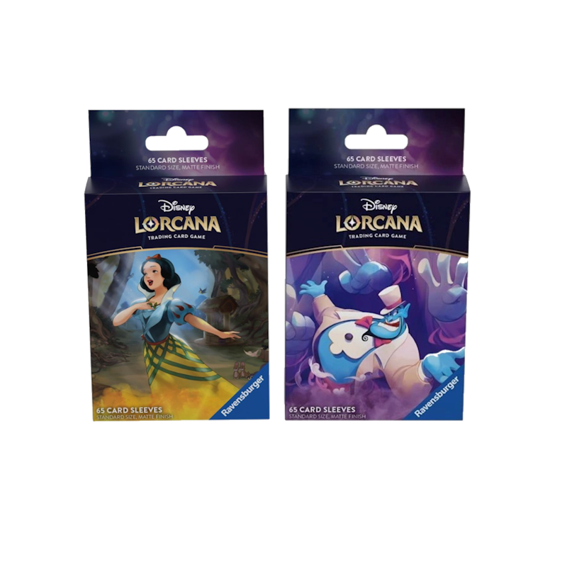 Elk pakket bevat 65 matte finish kaarthoezen met een Disney Lorcana glinstering. De eerste personages die te zien zijn, zijn Sneeuwwitje en Genie.